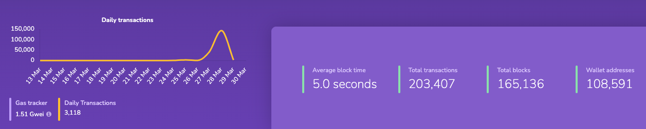 The beta test network for Shibarium is named PUPPYNET. As per the blockchain explorer BlockScout, as of 8:56 p.m. UTC on March 30, the beta version of Shibarium has successfully executed more than 203,407 transactions. Data from this PUPPYNET explorer indicates that the number of wallet addresses utilizing Shibarium beta has reached 108,591, growing from zero in just a matter of days. Presently, the gas fees are 1.51 Gwei, which is virtually cost-free.