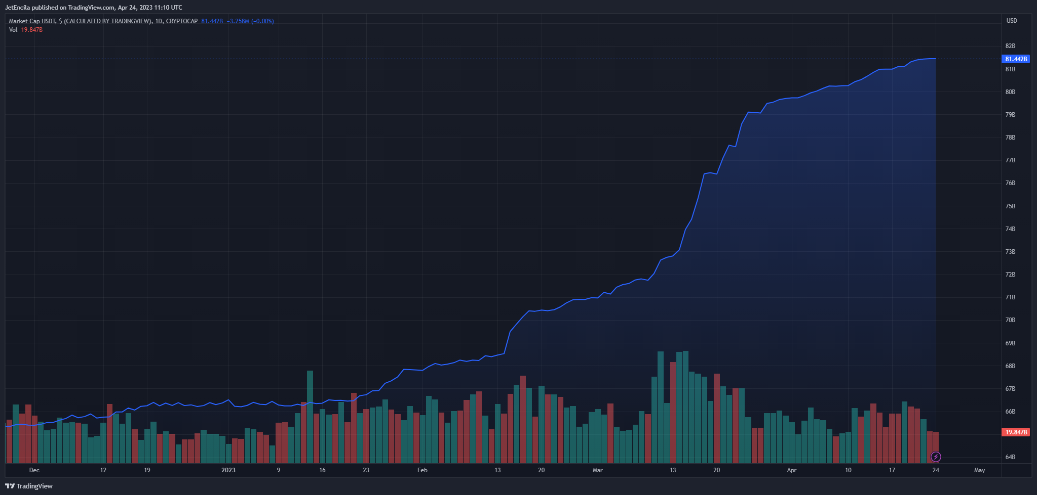 USDT, the largest stablecoin in the crypto market, is once again approaching its all-time high market capitalization of $82 billion, which it briefly touched during the collapse of LUNA last year.