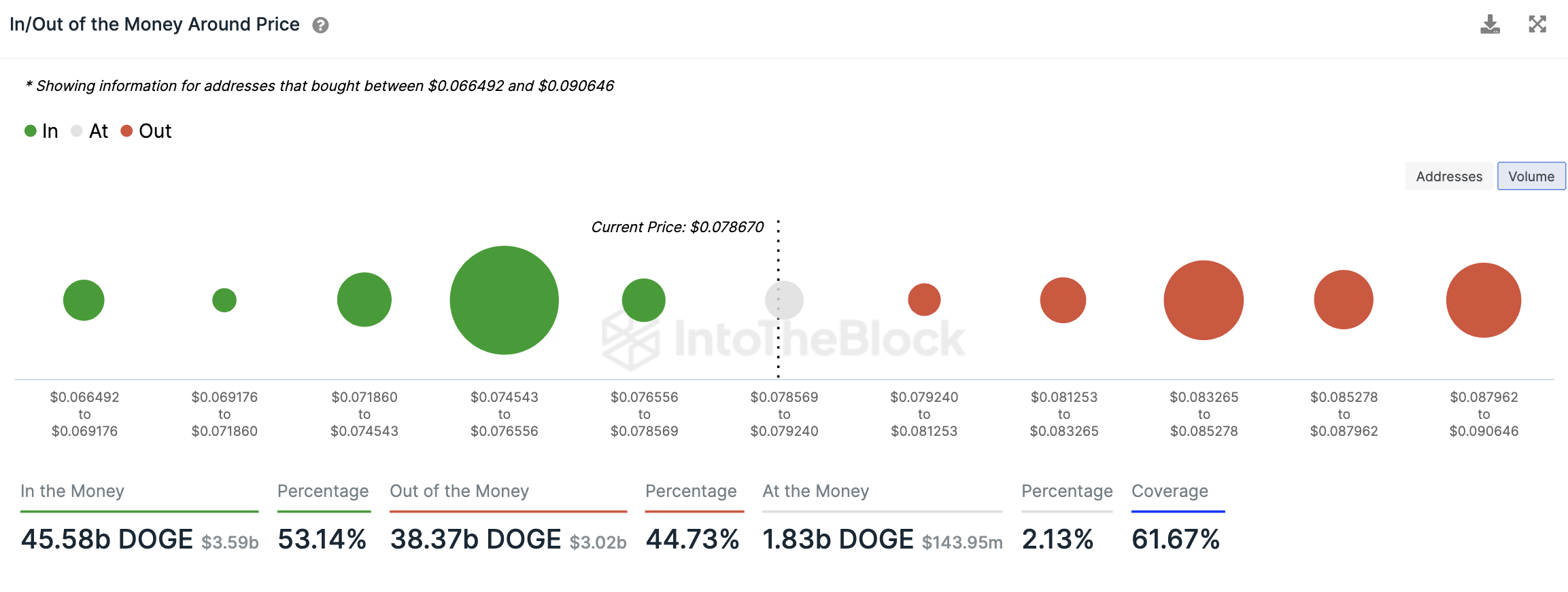 However, at the moment, Dogecoin is still more of a profit-making than a loss-making crypto asset. Thus, the share of addresses in the money in DOGE is 53.72%, which is 2.41 million addresses of the total number. The ratio is obviously fragile, given that more than half of the coins now in profit could turn red, as mentioned above.