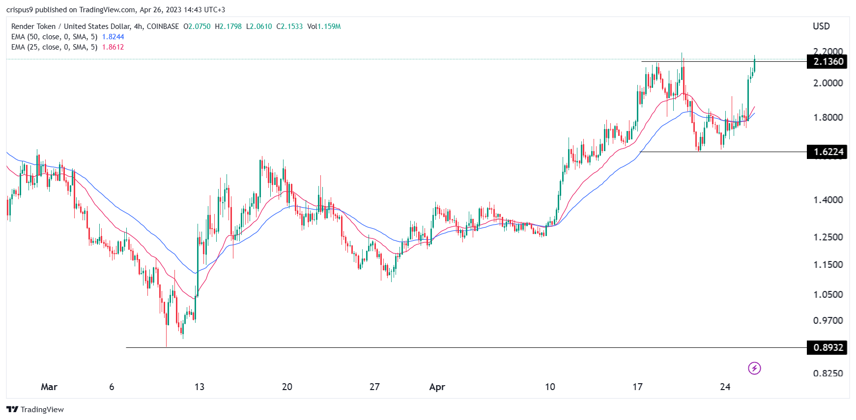 Render Token (RNDR) price surged to a key resistance level after the developers made a major milestone. The token surged to a high of $2.20, which was the highest point this month. In all, the token has been one of the best-performing cryptocurrencies after rising by more than 140% from the lowest level in March.