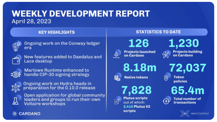 Input Output Global (IOG), the entity responsible for Cardano’s research and development, has just published its weekly development report for the week ending on Friday, April 28, 2023. It looks like, once again, considerable progress has been reported across multiple areas.