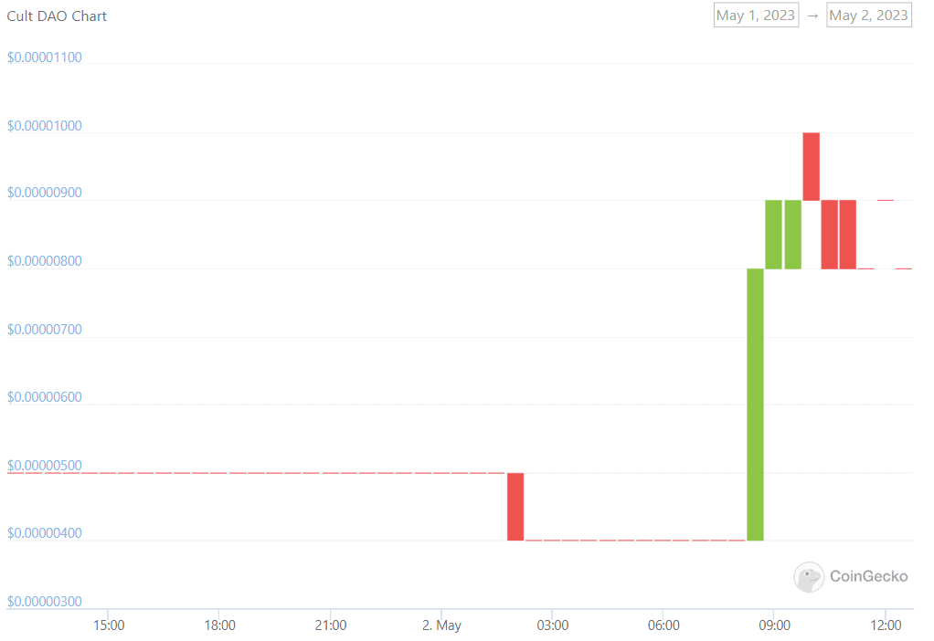 - Despite not revealing what stands behind that phrase, Twitter’s CEO caused a price spike of CULT (the native token of Cult DAO), which spiked by more than 70% in a matter of hours.