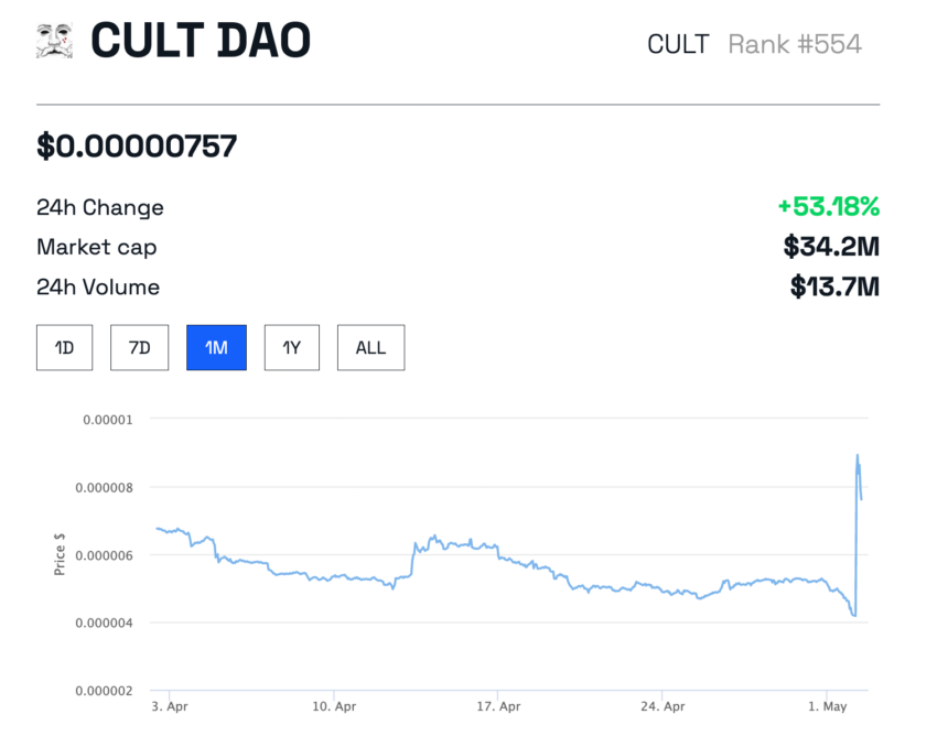 The price rise happened as the community members speculated if Elon Musk was tweeting about Cult DAO. As of writing, CULT is trading at $0.00000757, up more than 53% in 24 hours.