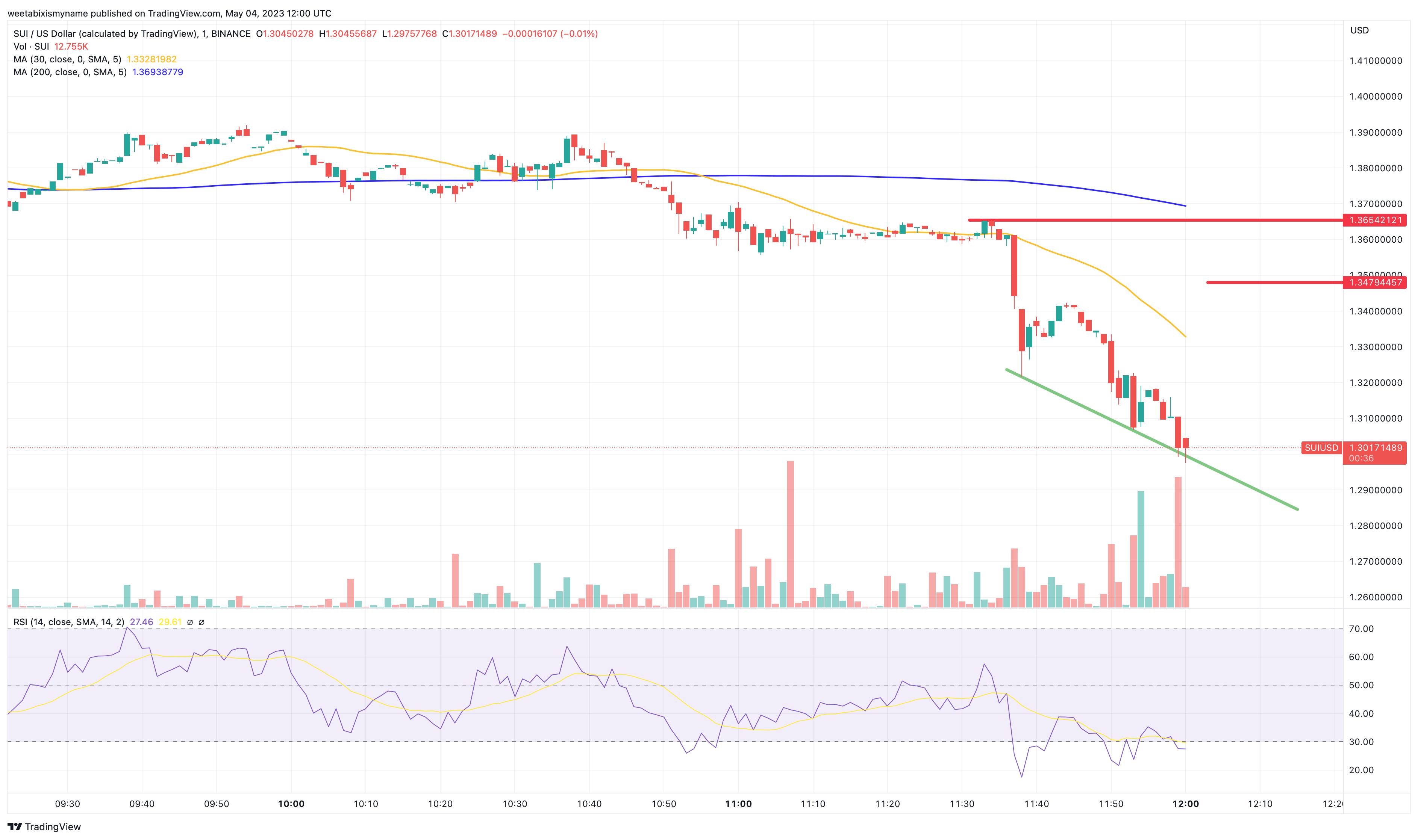 Sui's chart suggests that the coin is nearing a bottom, after falling from record highs yesterday.
