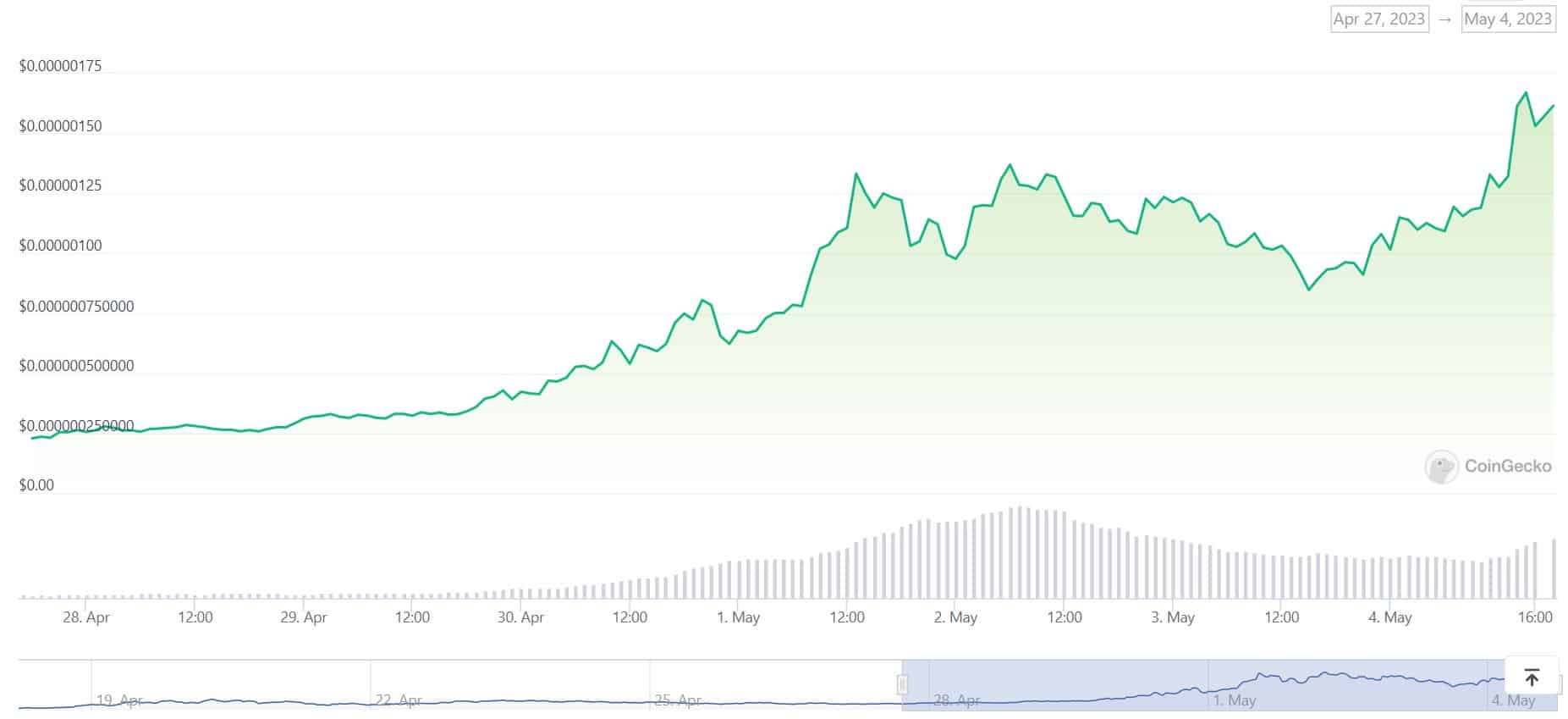 Pepe Coin (PEPE), a memecoin launched in mid-April, has quickly emerged as one of the sensations in the cryptocurrency industry. Its price has skyrocketed by a staggering 638% for the past week, whereas the gains for the past 24 hours alone reached 90%. The asset’s market capitalization has also skyrocketed to almost $700 million.