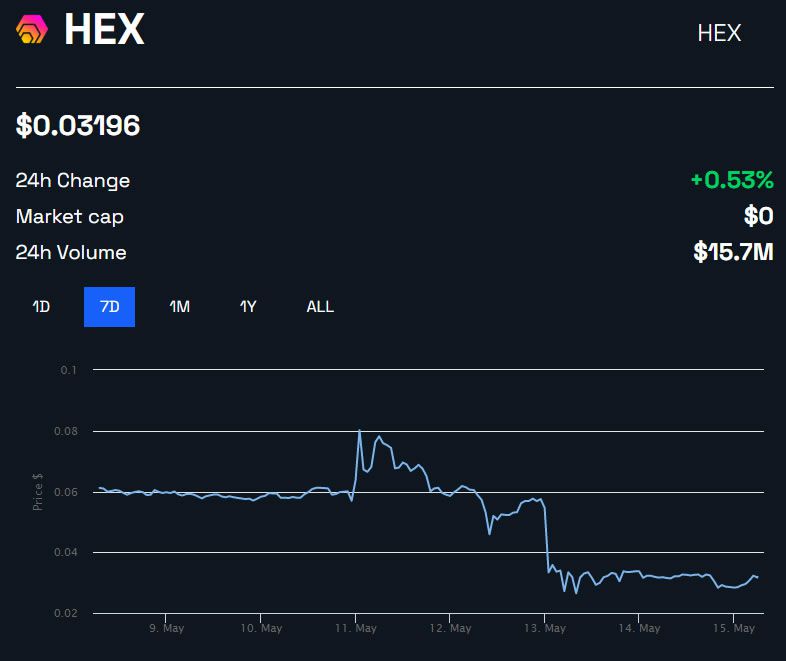 HEX prices have tanked a whopping 60% over the past five days. On May 11, the token was trading at $0.08, but today it has fallen to $0.03.