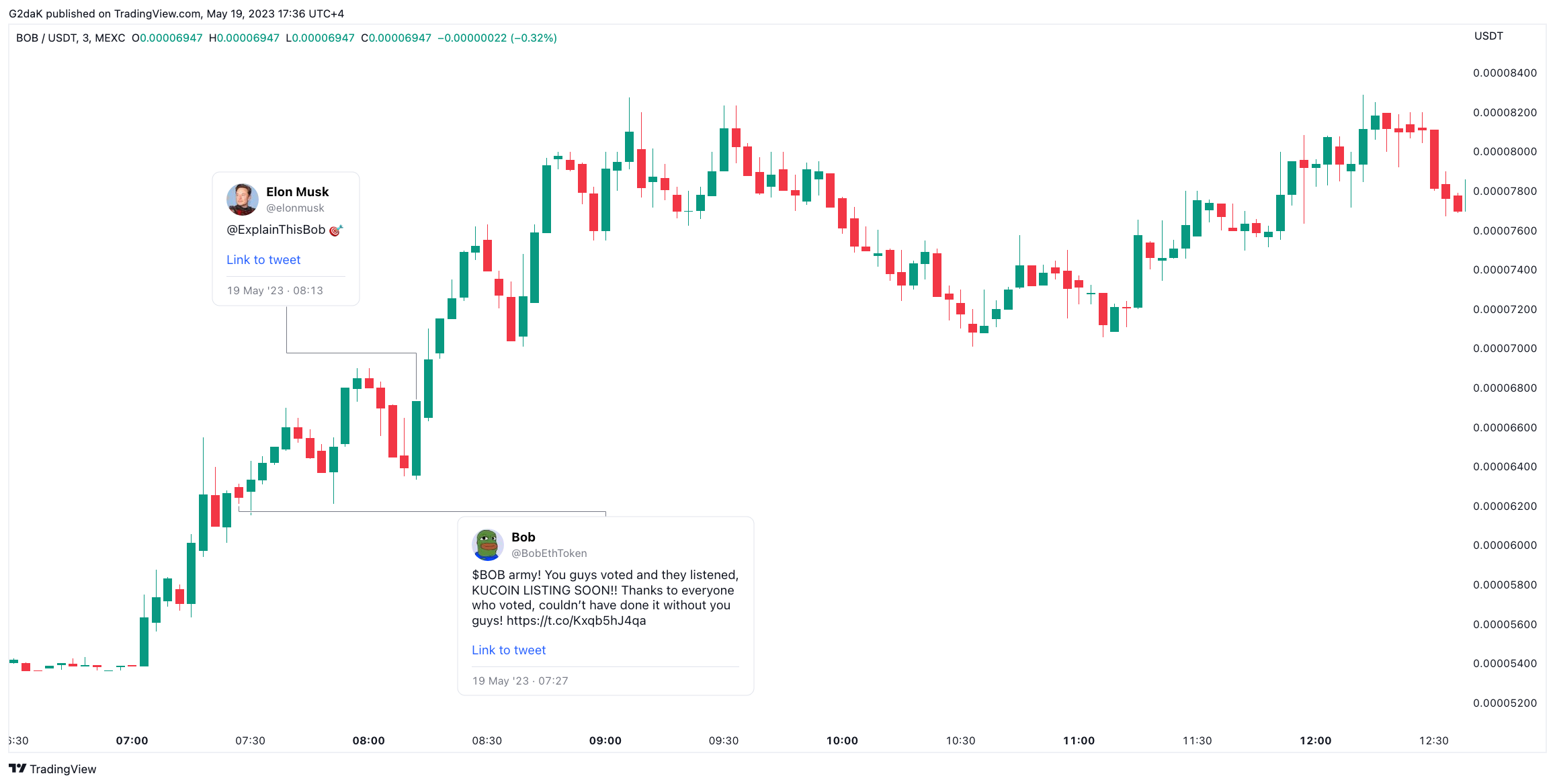 What's interesting is that 45 minutes before Musk's reaction to the tweet, it was announced that BOB would be listed on major exchange KuCoin. But just as interestingly, the upward price movement of the token began 12 minutes before the announcement and was no less than 16% by the time the listing was announced.