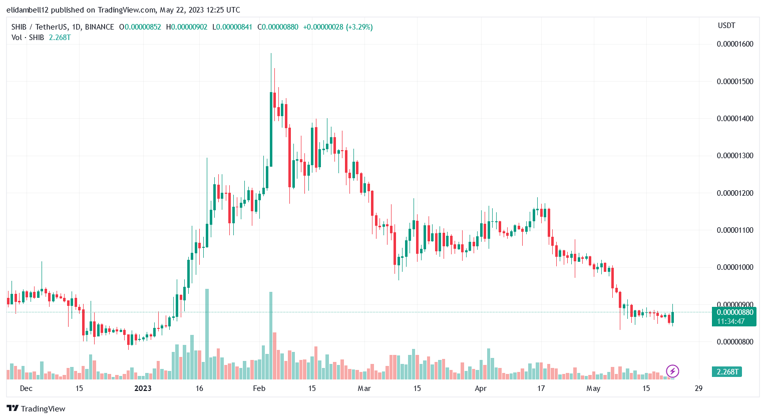SHIB is experiencing volatility today as it seeks to recover from the recent price drop in May, leading to a death cross on May 10, 2023.