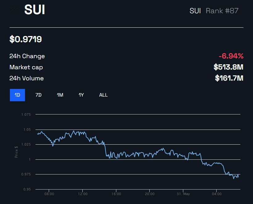 Unsurprisingly, SUI prices have tanked leading up to the big unlock event. As a result, the token was trading down 7% on the day at $0.973 at the time of writing.