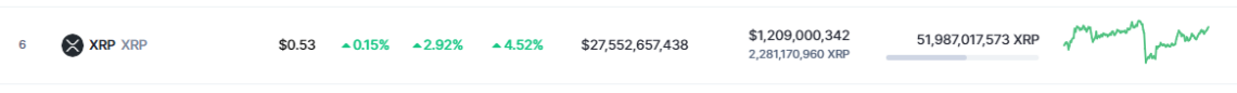 The positive investment inflows have had a tangible impact on the price of XRP, which has responded with remarkable upward momentum. CoinMarketCap reports XRP’s price at $0.53, indicating a noteworthy 2.9% rally in the past 24 hours. This price surge showcases XRP’s resilience amidst the challenging landscape of the cryptocurrency market.