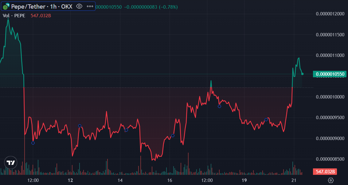 PEPE token, inspired by the popular 2000s meme Pepe the Frog, gained 15% in the past 24 hours. The asset is trading at $0.000001065 with an almost $200 million trading volume, marking a 131% rise at the time of writing.