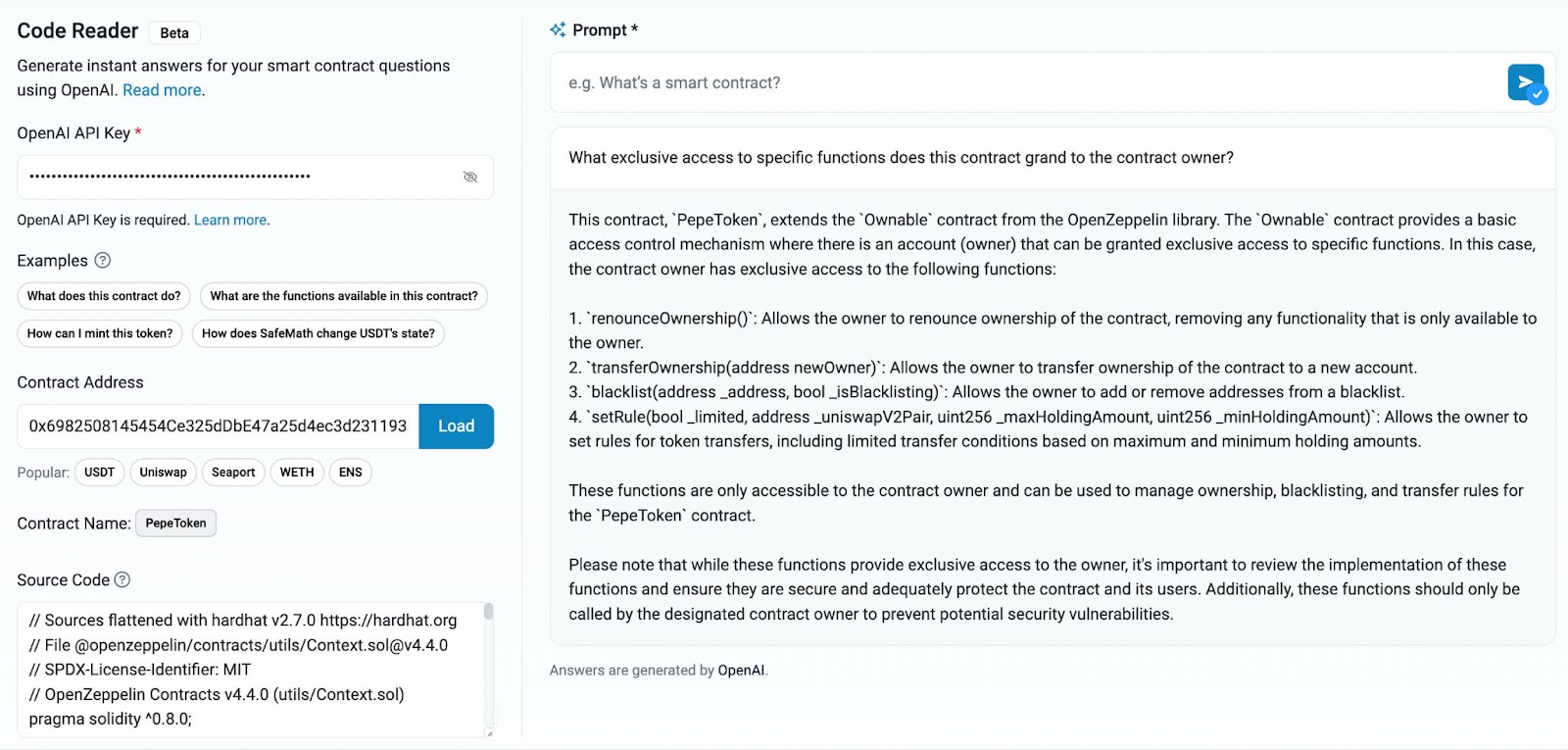 More experienced developers can use Code Reader to learn how to integrate a given smart contract with their own decentralized apps using natural language.