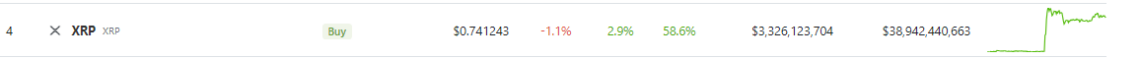 At present, Coingecko displays XRP’s price at $0.7412, reflecting a 2.9% rally within the past 24 hours alone. Over the course of the previous seven days, XRP has experienced a remarkable surge of 58.6%.