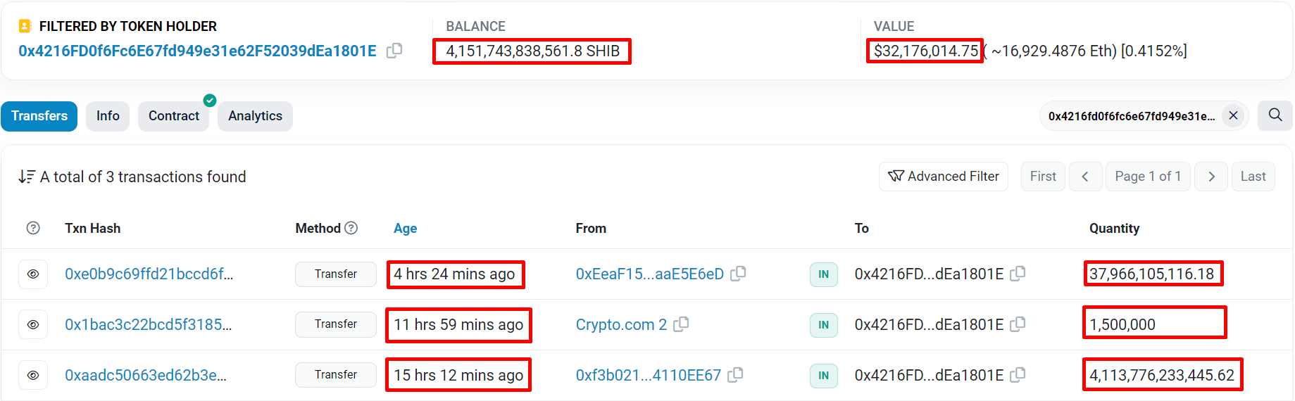Etherscan.io data reveals that the newly-activated whale added a staggering 4,151,743,838,561 (4.15 trillion) SHIB, worth $32,176,014 ($32.17 million) to her wallet. The massive accumulation took place in three separate transactions.