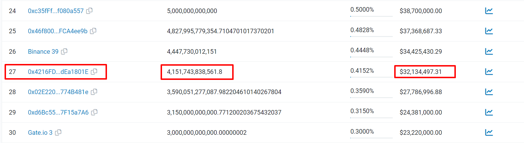 Following this accumulation, the newly emerged Whale becomes the 27th biggest holder of SHIB.
