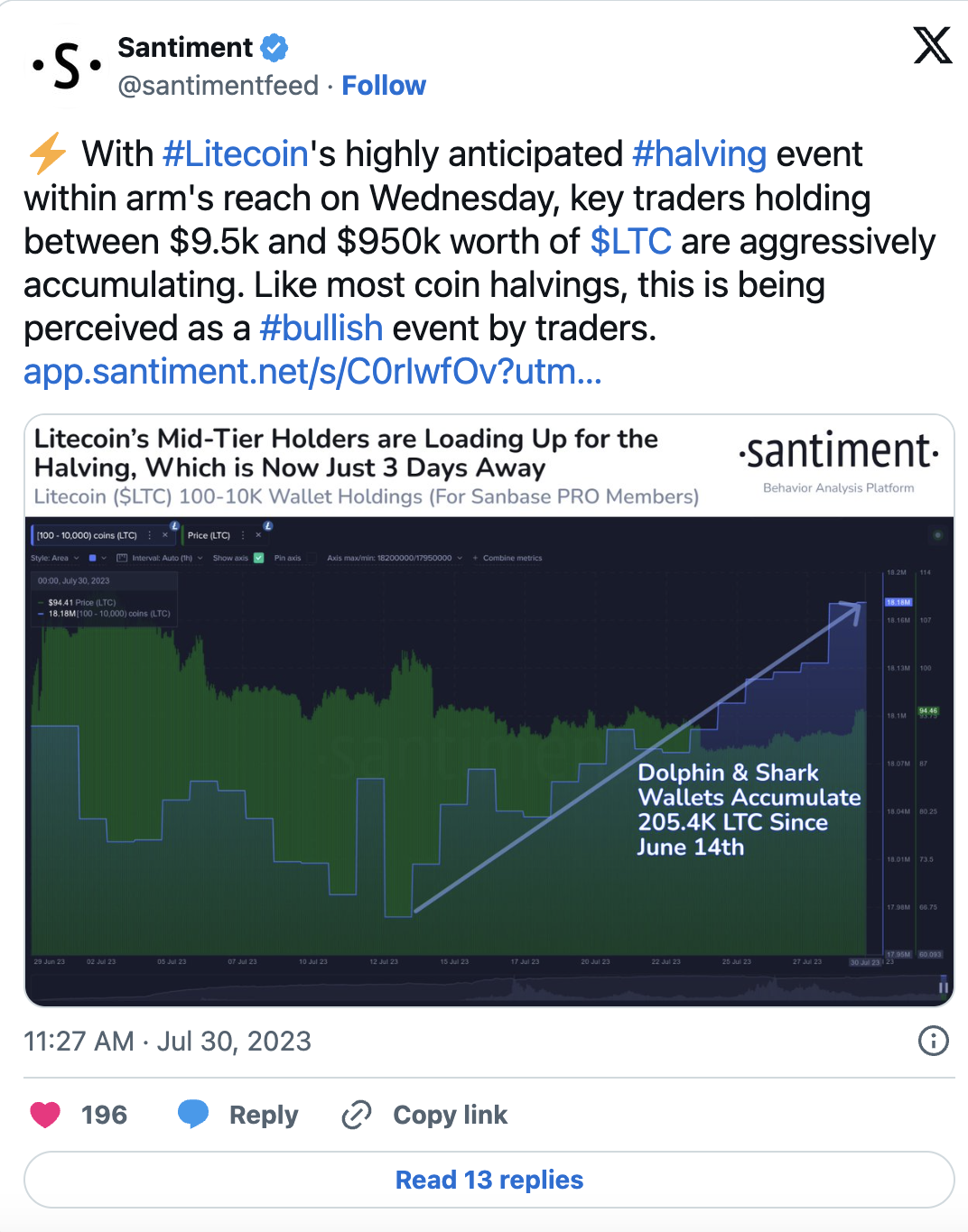 Market data analysis platform Santiment provides evidence of this upward trend. Wallets with values ranging from 9.5 thousand to 950 thousand dollars have been actively accumulating the cryptocurrency since June 14, indicating broad market optimism for Litecoin’s post-halving expectations. Litecoin experienced a 5% increase in its 24-hour price and over 220% increase in trading volume, reaching intraday highs of $95. Over $1 billion worth of LTC has been traded in the past 24 hours, indicating a lively market eagerly awaiting the halving event.