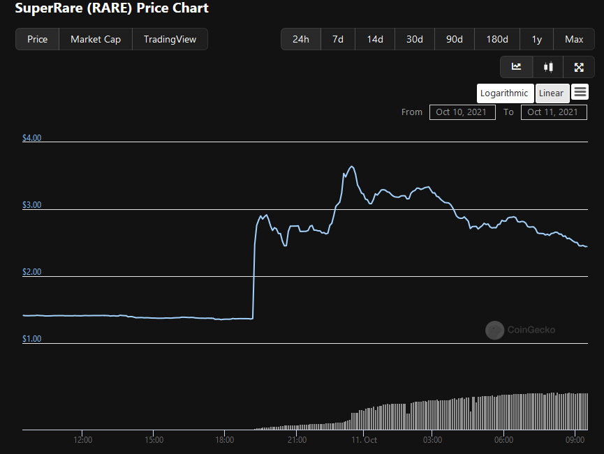 The non-fungible token (NFT) marketplace SuperRare (RARE) jumped from $1.35 to $3.64 – a 169% price increase – after the announcement. The altcoin currently sits at $2.51.