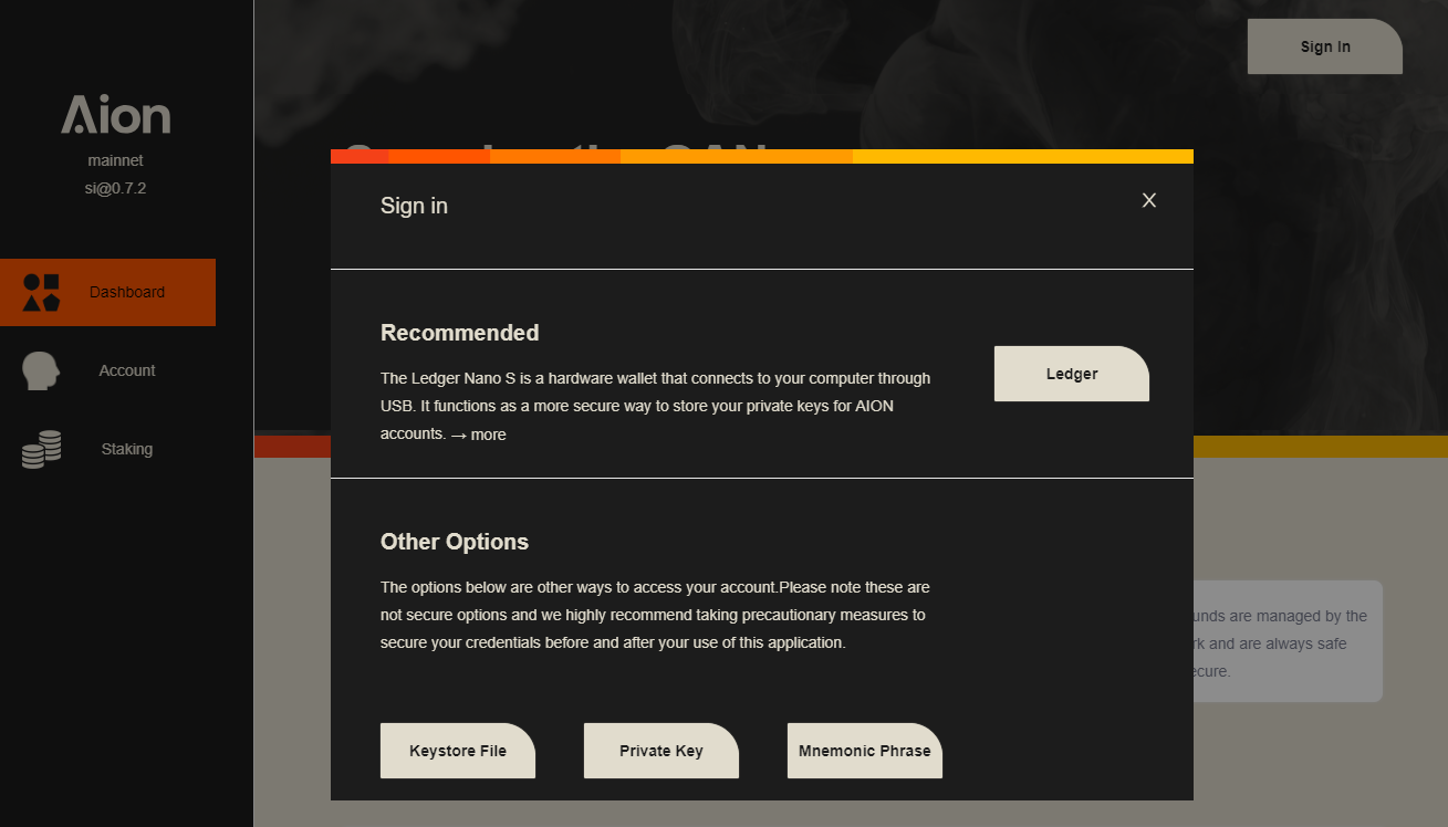 The staking interface enables users to access their account through Ledger, key-store, private key, and mnemonic phrase. The desktop application is available on Windows, Mac, and Linux for key-store, private key, and mnemonic phrase.
