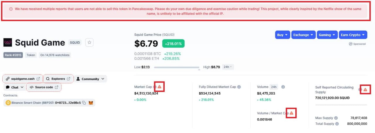 However, users of the SQUID token referencing the series are now facing issues selling the digital currency on the Pancakeswap platform, according to the notification appearing on CoinMarketCap, the most popular site for checking crypto volume and prices, and supply of coins. It says: