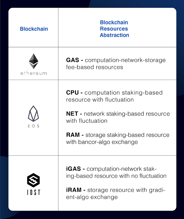IOST blockchain resource abstraction is perfectly balanced at two. These two are the iGAS and iRAM. The rationale behind this configuration is quite simple. First, most computing and network resources are always used jointly. Thus integrating them into one resource abstraction called IGAS is logical. Second, applications are either CPU-sensitive or storage sensitive. Since CPU has already been bundled with Network, storage has been configured as a separate resource called IRAM. Using this configuration enhances the utilization of computational and storage resources at the same time lowering the complexity of use.