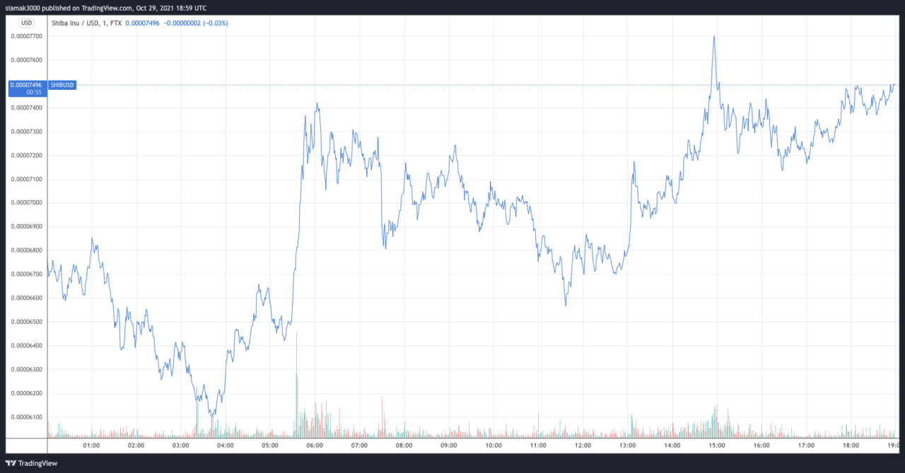 According to data by TradingView, on crypto exchange FTX, currently (as of 18:55 UTC on October 29), $SHIB is trading at $0.007463, up 12.73% in the past 24-hour period.