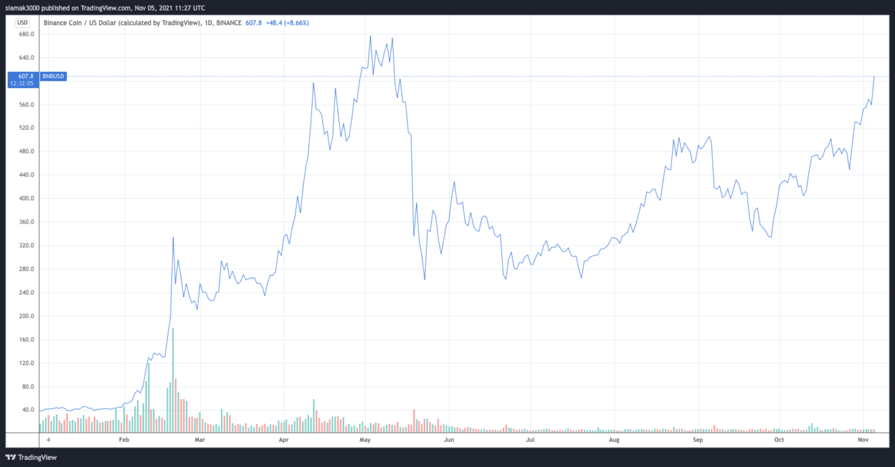 Currently (as of 11:15 UTC), $BNB is trading around $604.10, up 8.14% in the past 24-hour period. As for the year-to-date (YTD) period, $BNB has gone from around $37.80 to $604.10, which is a return-on-investment of roughly 1498%.