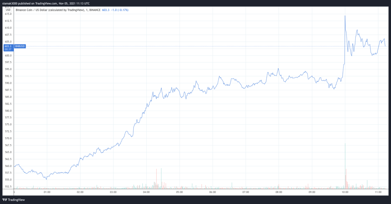 According to data by TradingView, a few minutes before the news about this sponsorship deal came out, which was around 10:00 UTC, $BNB was trading around $590.50. By 10:00 UTC, it had reached $614.40, which is so far today’s intraday high.