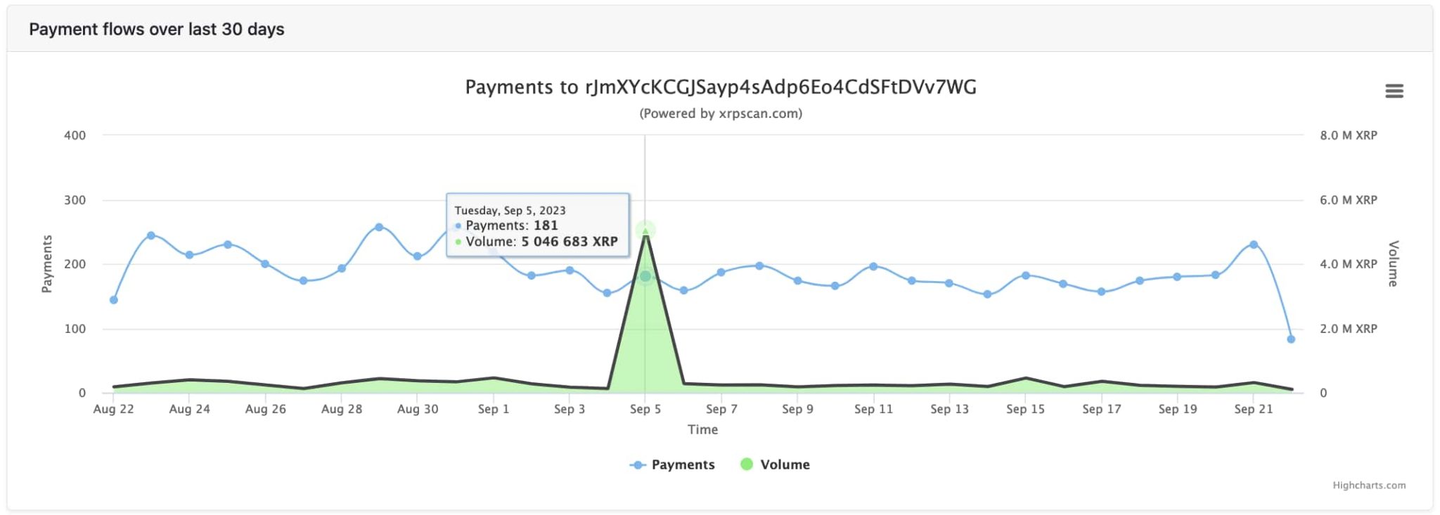 Historic transaction data for the address over the last 30 days shows a consistent daily payment flow since August 22, with a spike of over 5 million XRP in 181 payments, on September 5.