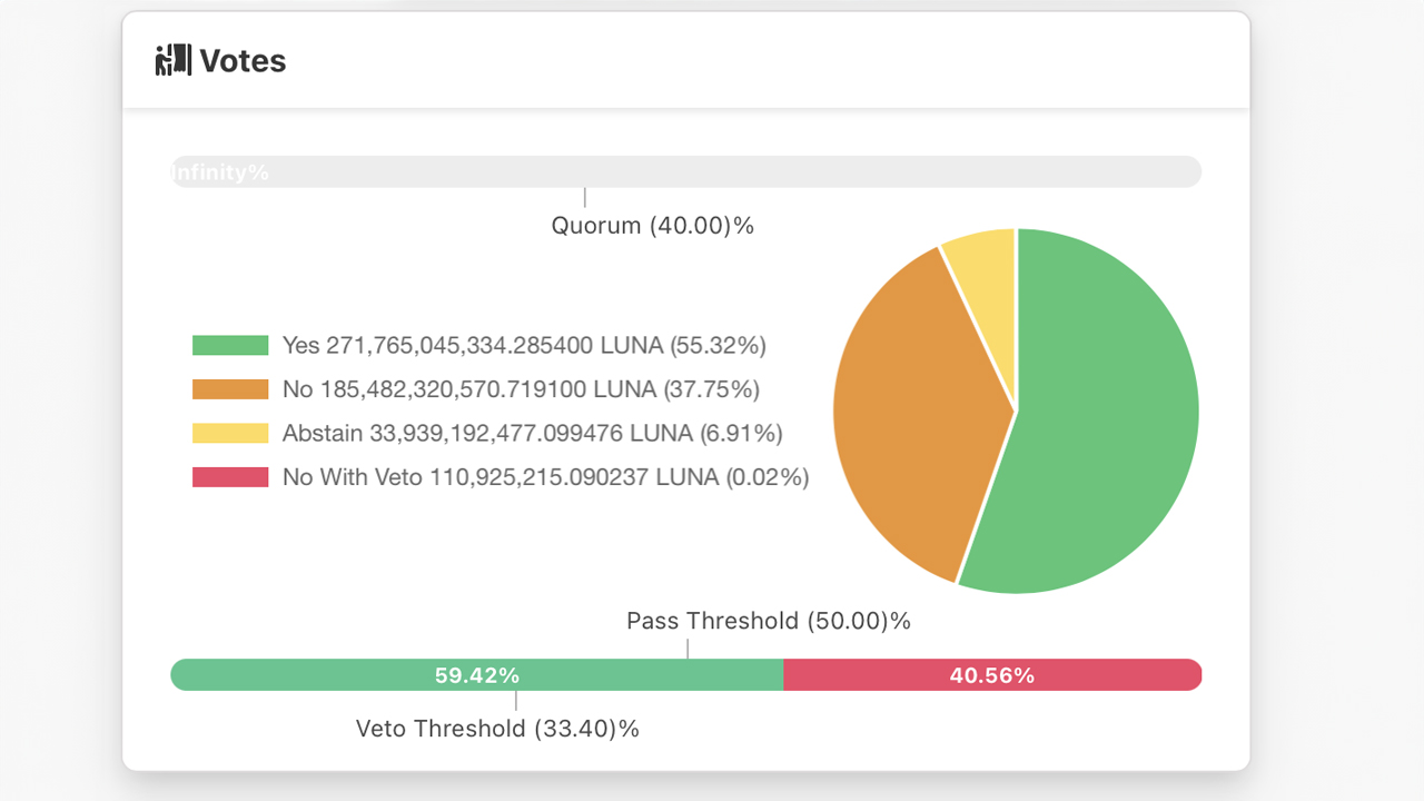Following a decisive vote by the Terra Classic community, an initiative to halt the creation of the previously termed stablecoin, terra usd (commonly referred to as UST or USTC), has been approved. Despite 40.56% opposition, 59.42% of the vote gave the nod for the software update.