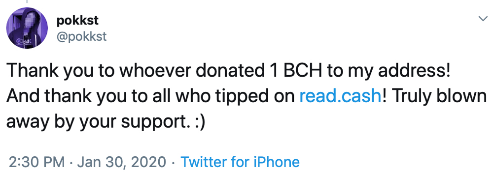 In April 2019, CC added Simple Ledger Protocol (SLP) token support. The following month, Pokkst implemented a new feature to CC that allows people to send bitcoin cash through a text message. Pokkst is also known for his work on the platform Tipbitcoin.cash, a tool that gives anyone the ability to tip their favorite streamer on Twitch using bitcoin cash. In addition to all the applications and wallets, the developer also worked on bitcoincashj, a Java implementation for Bitcoin Cash.