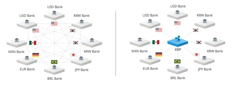 A graphic showing how the current intra-bank communication works (on the left), and how XRP could act as an intermediary that drastically reduces the scope of bank interactions and transactions. Image source: Ripple