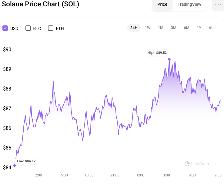 The Solana token (SOL) has shown signs of recovery following its recent price dip below the $100 mark. At press time, SOL was trading at $87.5, up by 4.22% in the past 24 hours. This uptick is potentially influenced by the new SPL Token extensions and the growing demand for Solana’s enhanced functionalities.
