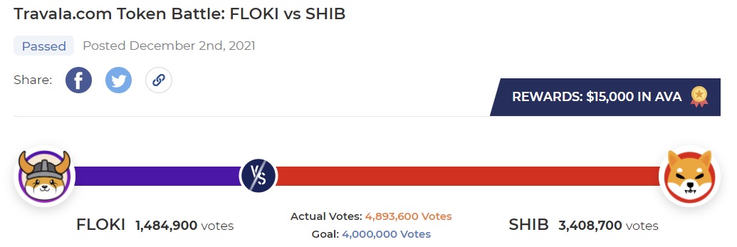 Travala set up a “token battle” between FLOKI and SHIB on Dec. 2. The company explained that the cryptocurrency with the most votes after 72 hours “will win a listing on Travala.com.” In addition, “All users who vote for either token will receive a share of $15,000 in AVA, which will be dispersed in accordance with the votes cast.”