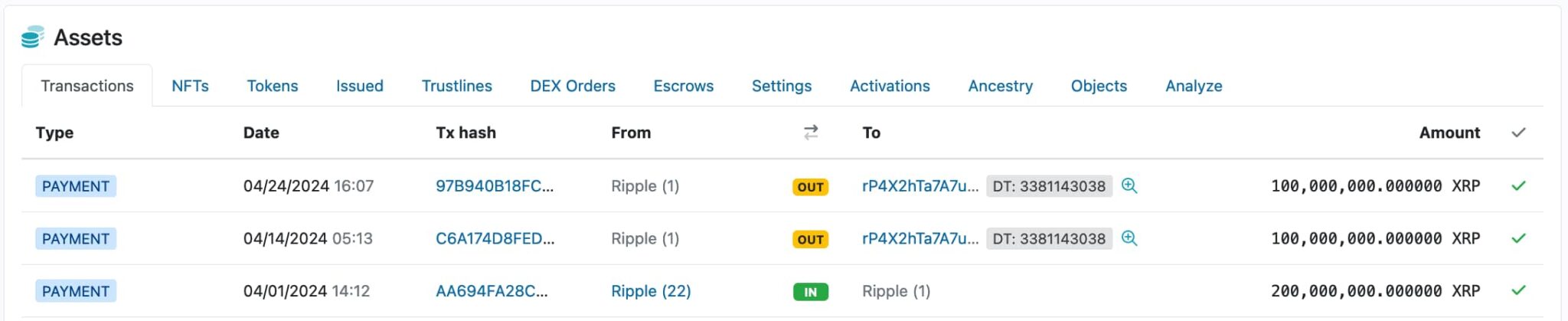 As developed, ‘Ripple (22)’ sent 200 million XRP to ‘Ripple (1)‘, the treasury account. On April 14, the company dumped $48.5 million worth of tokens after Iran’s offensive against Israel. Later, on April 24, Ripple got rid of the remaining 100 million XRP reserved for the sell-off.