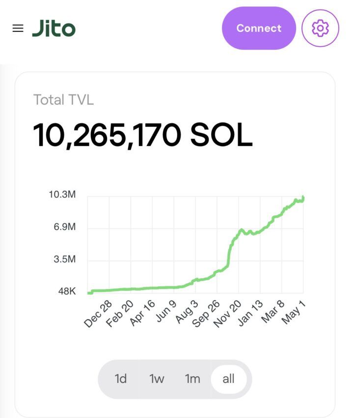 Jito, a liquid staking pool on the Solana blockchain, has recently announced a significant milestone. Its total value locked (TVL) has exceeded 10 million Solana (SOL). With Solana’s current price of $132.11, the number equals a staggering $1.32 billion.