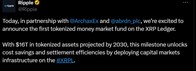 - Ripple launches the first tokenized fund on the XRP Ledger (XRPL), based on abrdn’s US Dollar Liquidity Fund, managing $3.8 billion.