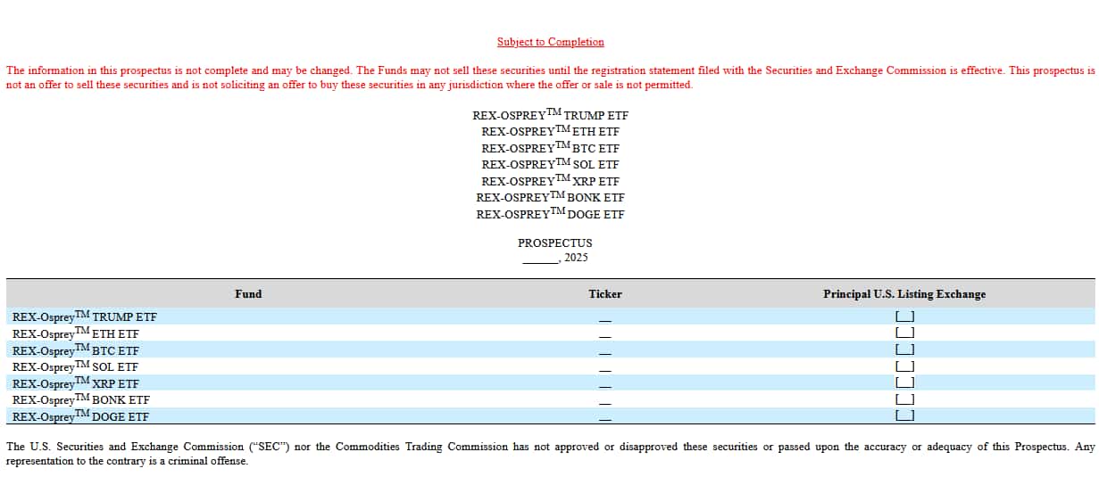 Per a January 21 filing made with the Securities and Exchange Commission (SEC), $1 billion exchange-traded fund (ETF) provider REX shares and Osprey Funds intend to launch 7 new cryptocurrency ETFs.