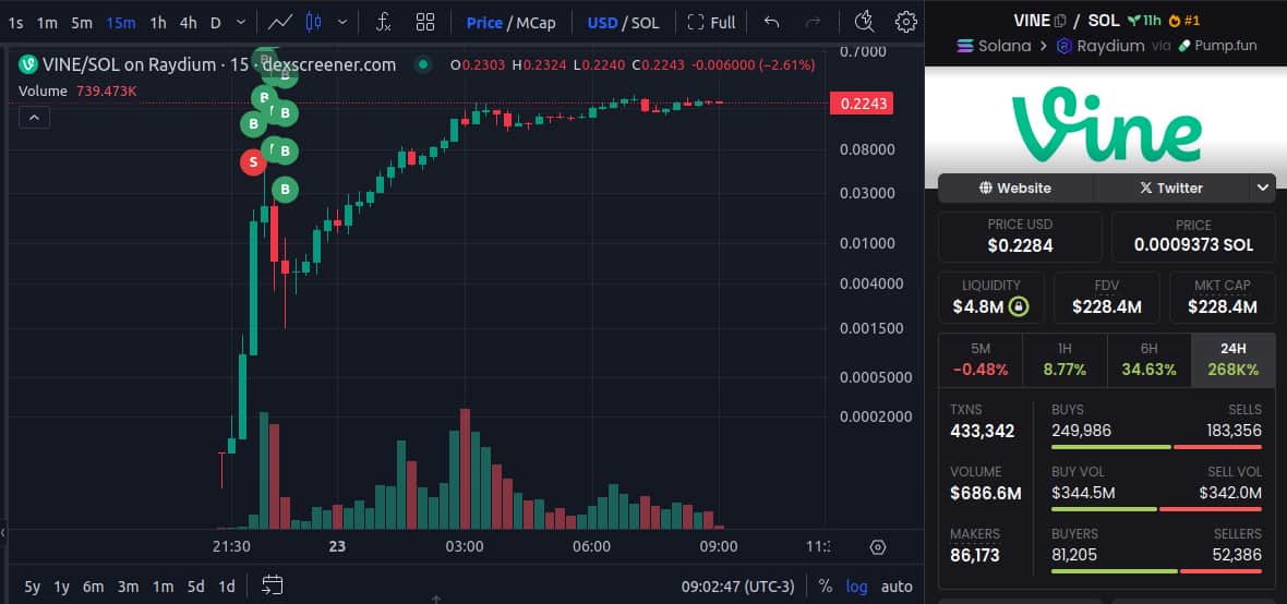 As reported, the trader first turned 20 SOL into 23 SOL with a quick trade of 1 million VINE. Right after selling it, however, VINE surged, causing the trader to ‘FOMO’ back in, buying far more at higher prices.