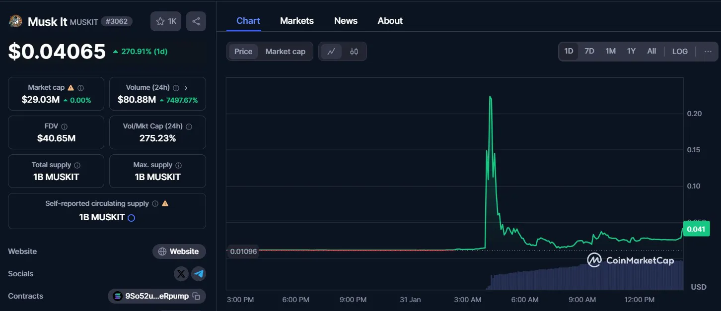 As per the data provided by the CoinMarketCap, Musk It holds a market cap of over $29 million, but the website flashes a disclaimer that this figure is self-reported. The token has recorded a surge of a massive 218% in the last 24 hours. Musk It is trading at an average price of $0.04, at press time. Its 24-hour trading volume is up by 7,462% to stand at $80.4 million.