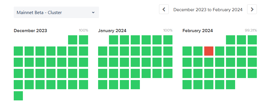 Solana incidents were even rare in 2023, with only one outage in February. As a whole, Solana had only two periods of zero bloc production in the past two years, all happening in February.