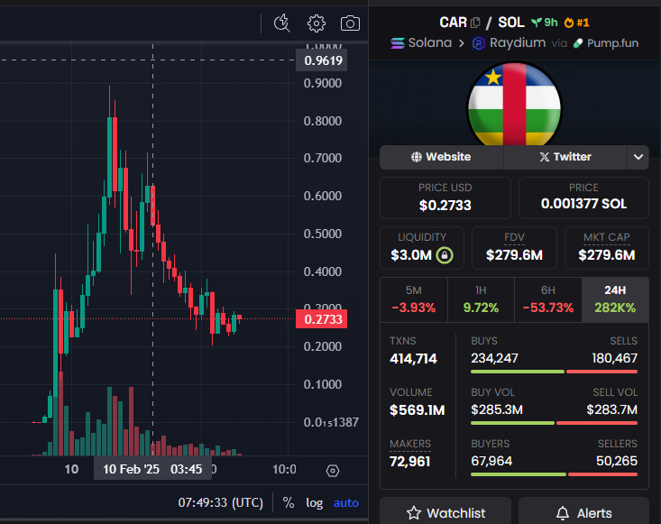 The asset itself was created through Pump.fun and completed its bonding curve on February 9, raising 85 SOL. The first DEX pair for the CAR token was live for less than 10 hours, but during that time, the asset rallied from $0.001 to a peak at $0.70, later erasing its gains to $0.25.