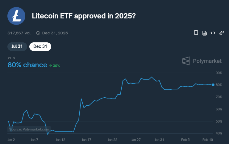 Market sentiment has shifted notably, with Polymarket data showing Litecoin ETF approval odds rising from 42% in January 2025 to above 80% currently.