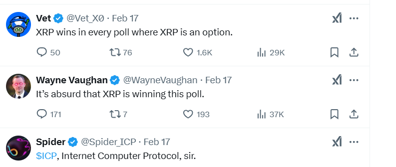 Interestingly, the result unsettled critics, particularly within the Bitcoin community. Pro-Bitcoin commentator Wayne Vaughan remarked, “It’s absurd that XRP is winning this poll.”