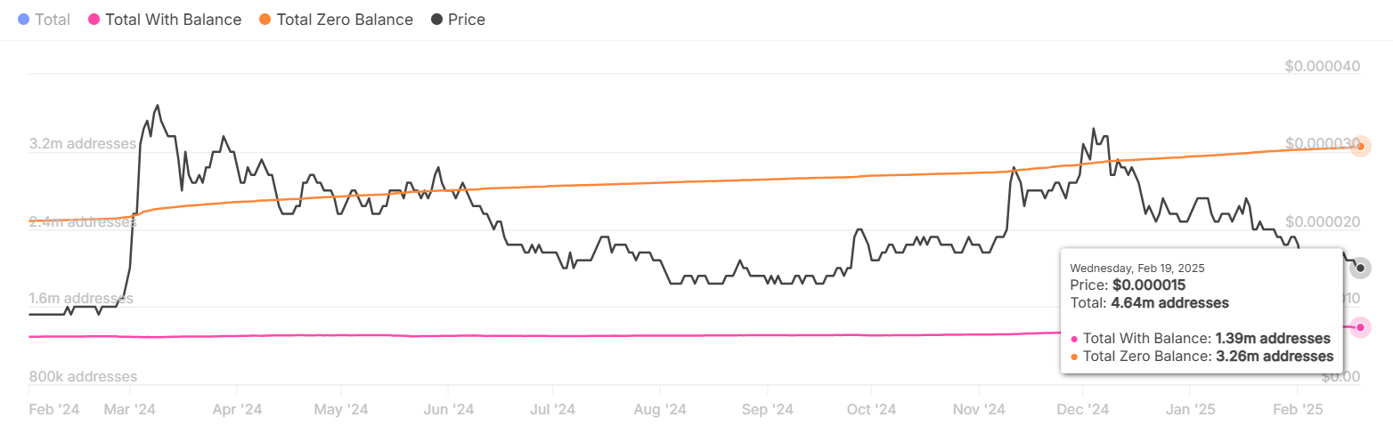 Interestingly, the latest data indicates that the meme coin now boasts a whopping 4.64 million addresses as of Feb. 19, 2025. This indicates an addition of about 840,000 addresses over the past year. Notably, this increase surpasses what the network observed from 2023 to 2024 by up to 200,000.