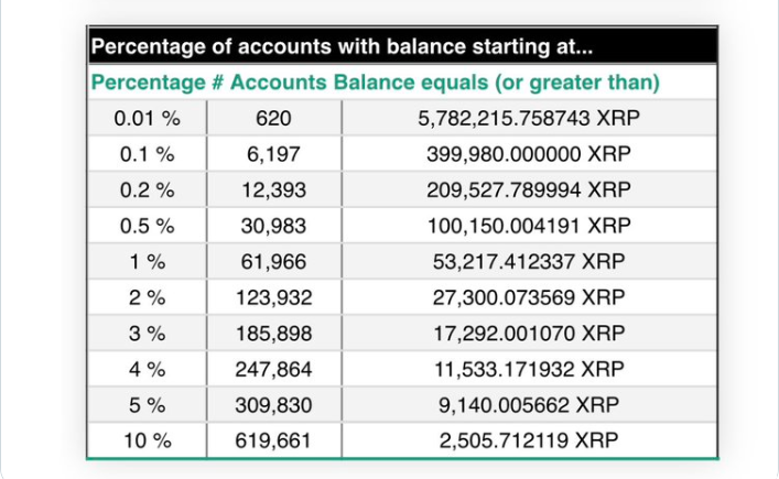 Specifically, he pointed out that owning just 2,505 XRP tokens is enough to be among the top 10% of addresses holding XRP. Notably, out of XRP’s 6.19 million wallets, only 619,661 addresses hold 2,505 or more.
