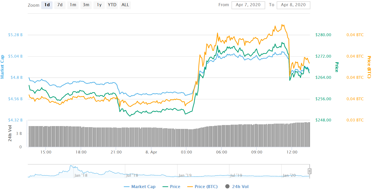 In the past twenty-four hours, the spot price of Bitcoin Cash surged 11.2%, from $249.23, up to $277.22. However, the coin’s price crashed back down to around $262 less than an hour later.