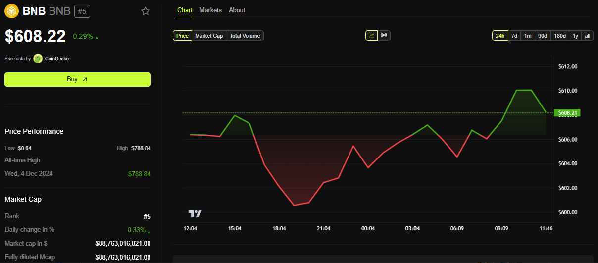 Despite this news, BNB’s price is up by a modest 0.29% in the last 24 hours. As of this writing, it was trading for $608.22.