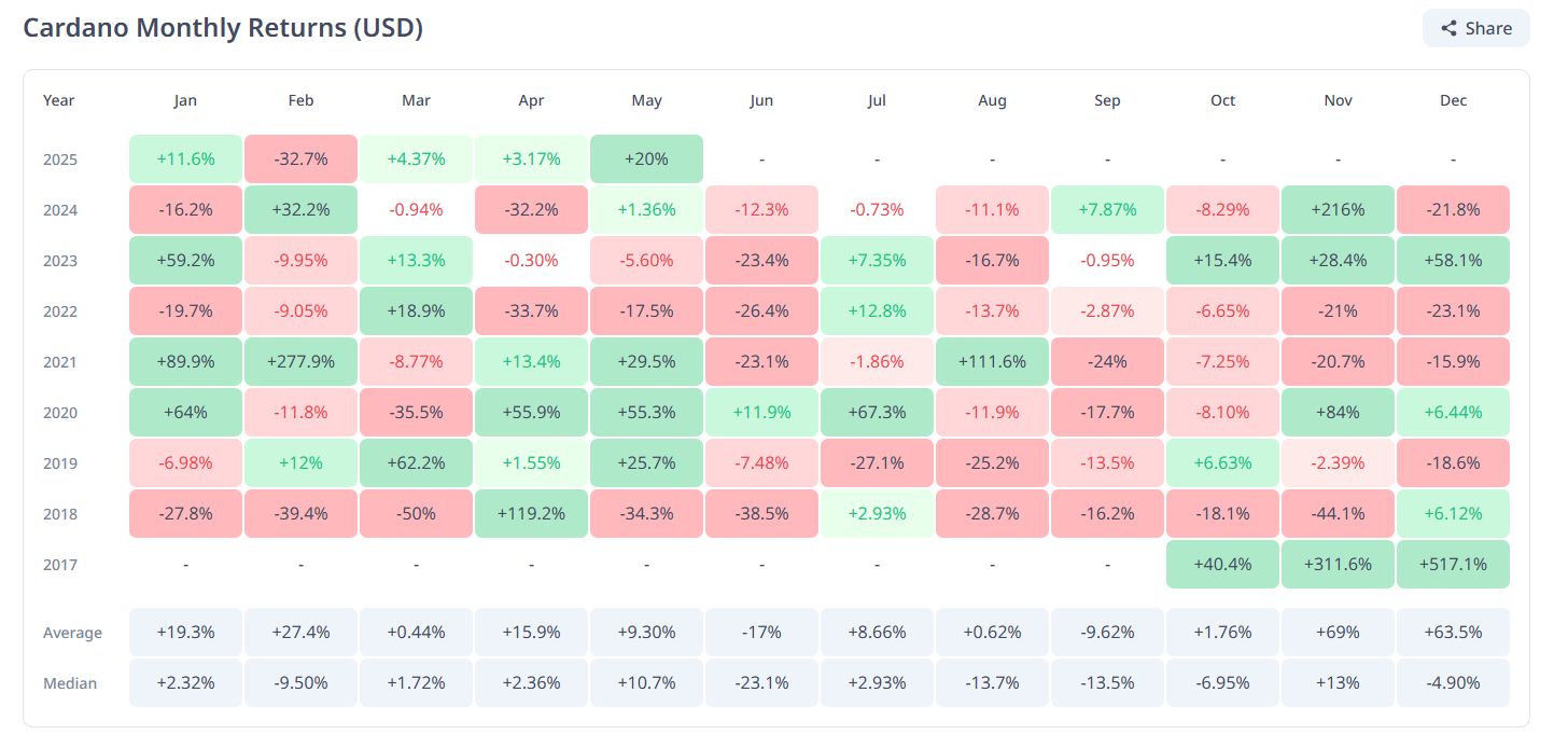 A closer look at ADA’s monthly historical data between May 2020 and May 2025 offers key insights.