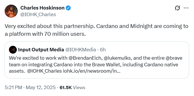 Cardano (ADA) may be stepping into a new visibility phase, as Charles Hoskinson said that Input-Output Global (IOG) has partnered with the Brave browser.