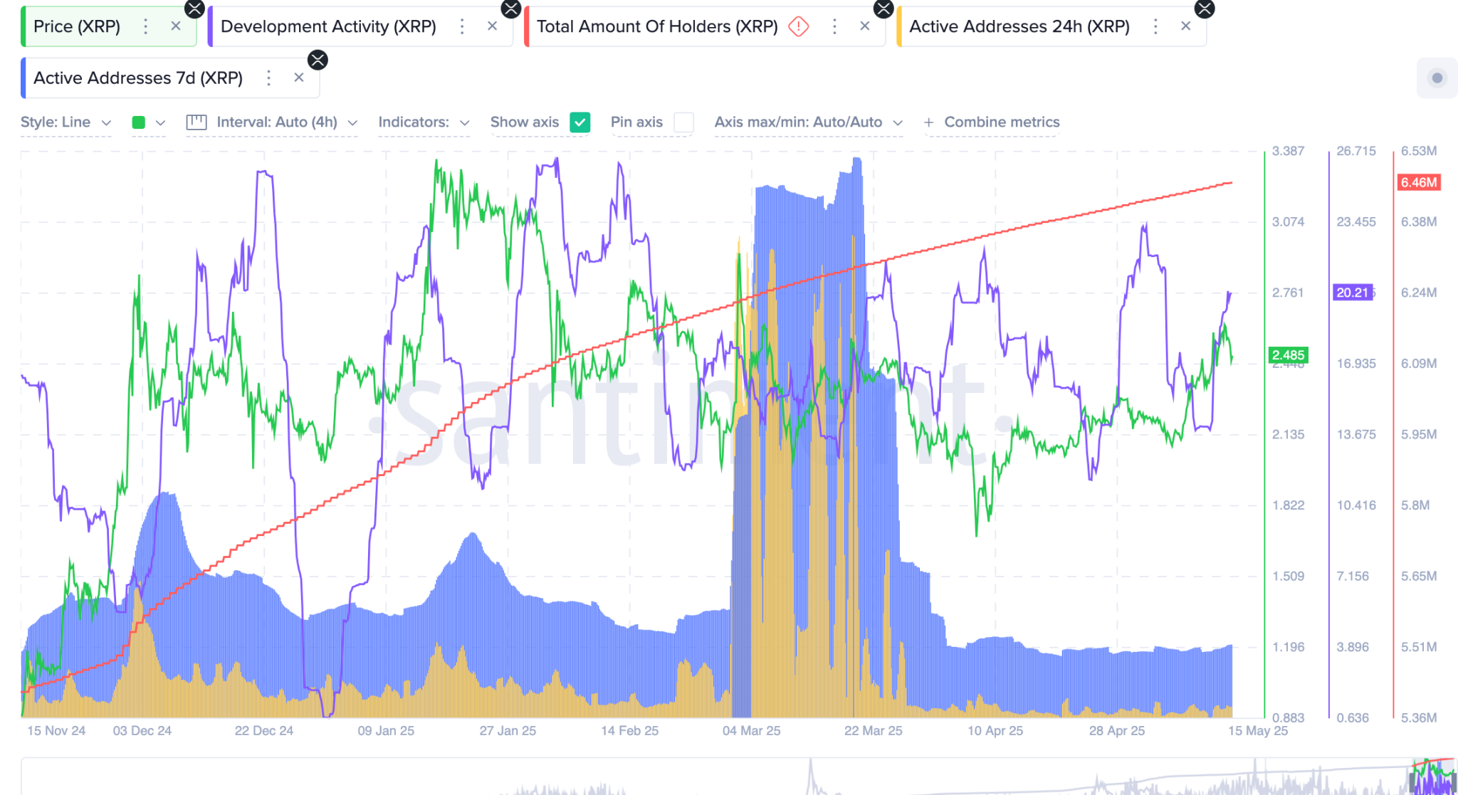 However, separate metrics tracking holder activity present a different trend. Another Santiment chart shows the total number of XRP holders has now reached 6.46 million. This steady increase signals that more participants continue to accumulate XRP over time.